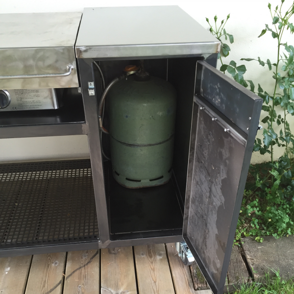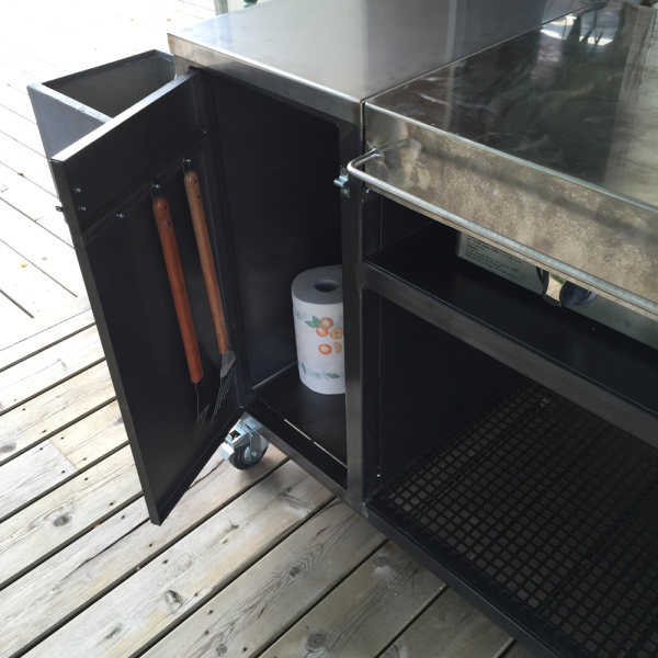 Meuble plancha à roulettes, avec différents compartiments. Du sur mesure.