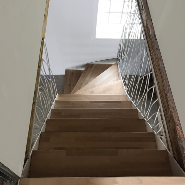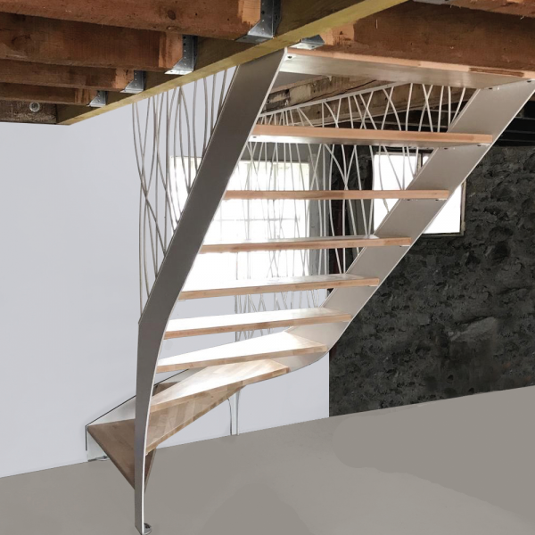 Escalier quart tournant balancé et son garde corps aléatoire, thermolaqué blanc.