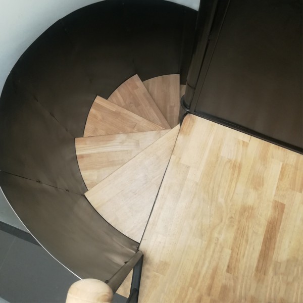 Escalier hélicoïdal en métal peint et bois ciré, avec garde-corps intégré.