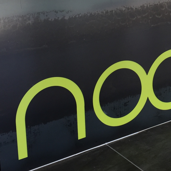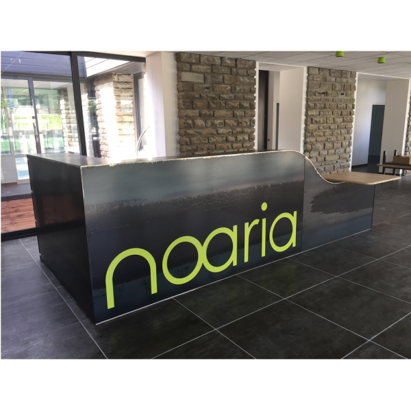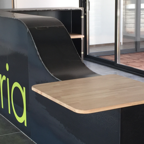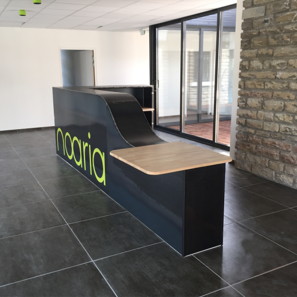 Borne d'accueil sur mesure en acier noir verni et hêtre.