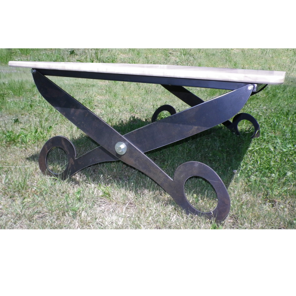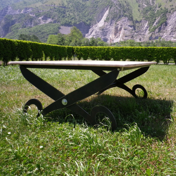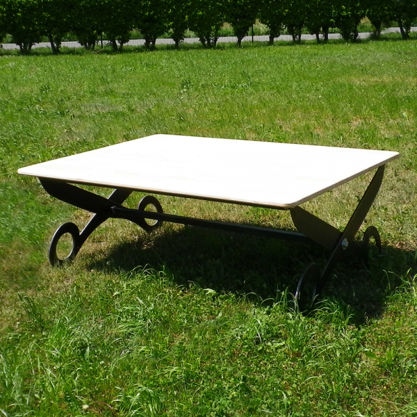 TB20 marie un plateau en hévéa clair ciré à des pieds d'acier brut meulés de forte personnalité (les marques rappellent l'atelier dont ils sont issus).