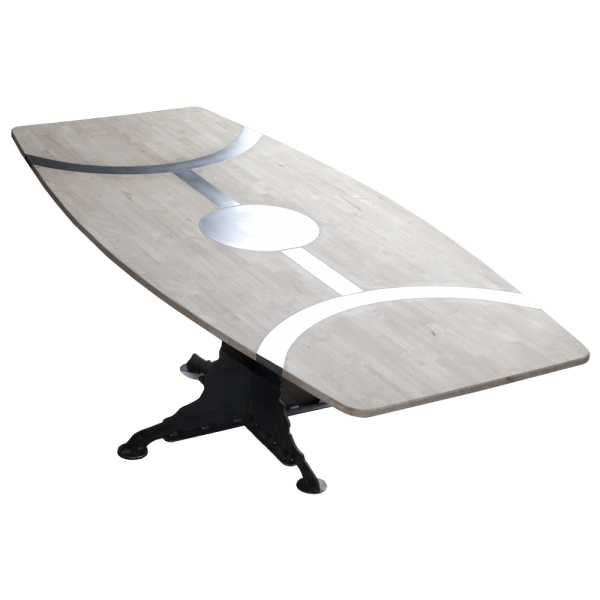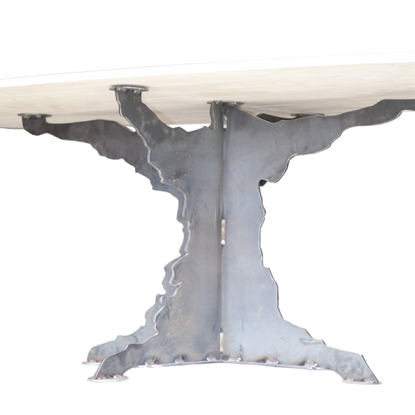 Son pied en acier brut figure un tronc d'olivier. Plateau en hévéa avec inclusion d'acier en lignes pures. Chaque tôle d'acier brut offre des nuances différentes qui rendent votre table unique.