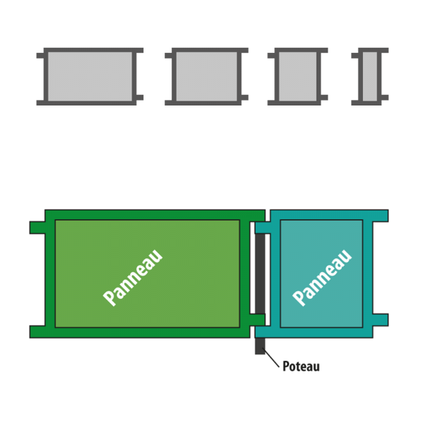 4 tailles de panneaux couvrent l’ensemble des possibilités de construction. Panneaux réversibles, structure apparente ou non.