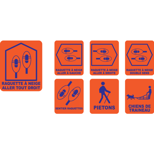 Panneau balisage pour ski de fond : sens raquettes à neige, piétons, abris, chiens traineaux... Exemples non exhaustifs.