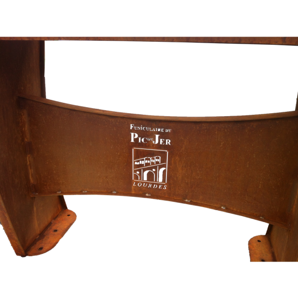 Support pour table d'orientation en acier découpé, finition rouillée.