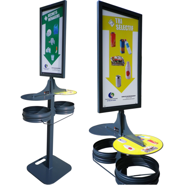 Poubelle 2 x 110 litres, sur tube acier avec nervures de renforts. Sur pied, avec encoche pour un transport facilité. Peinture époxy RAL au choix.