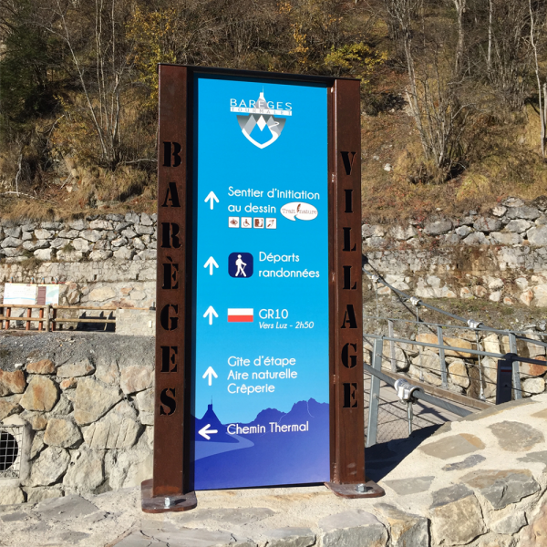 Totem pied et support acier finition rouille naturelle stabilisée.