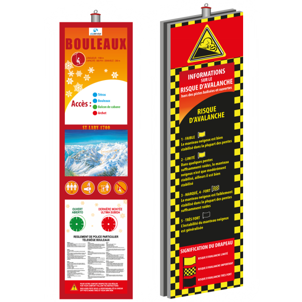 L'indétournable de la signalétique en station de ski. Ce totem de remontées mécaniques présente plan de pistes, informations spécifiques et mentions obligatoires de façon très lisible.