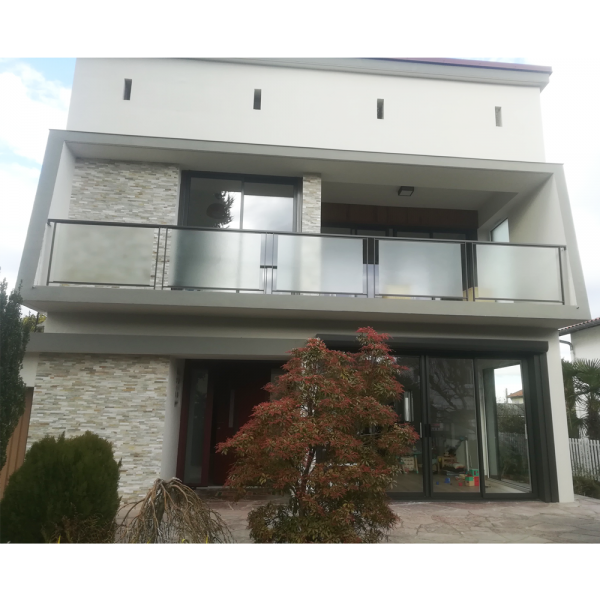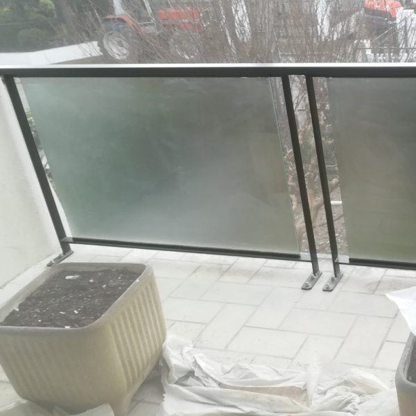 Garde corps en acier thermolaqué et verre opaque.